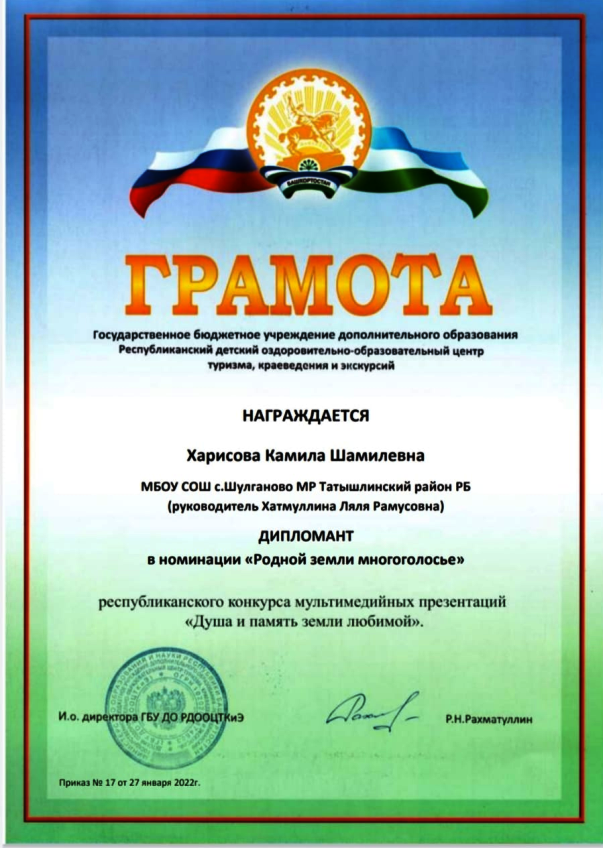 Поздравляем дипломанта республиканского конкурса мультимедийных презентаций "Душа и память земли любимой" обучающуюся 6 класса Харисову Камилу и ее руководителя Хатмуллину Л.Р. Молодцы! Дальнейших успехов!