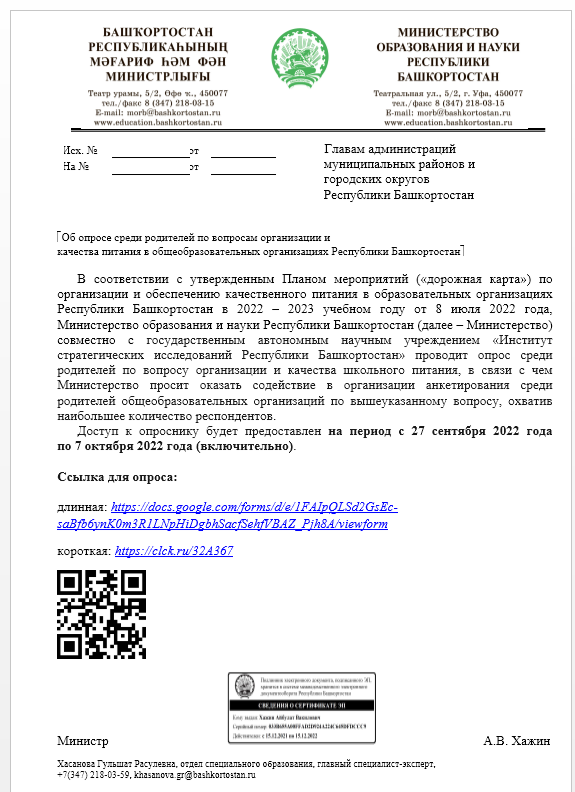 В соответствии с утвержденным Планом мероприятий («дорожная карта») по организации и обеспечению качественного питания в образовательных организациях Республики Башкортостан в 2022 – 2023 учебном году от 8 июля 2022 года, Министерство образования и науки Республики Башкортостан (далее – Министерство) совместно с государственным автономным научным учреждением «Институт стратегических исследований Республики Башкортостан» проводит опрос среди родителей по вопросу организации и качества школьного питания, в связи с чем Министерство просит оказать содействие в организации анкетирования среди родителей общеобразовательных организаций по вышеуказанному вопросу, охватив наибольшее количество респондентов.
