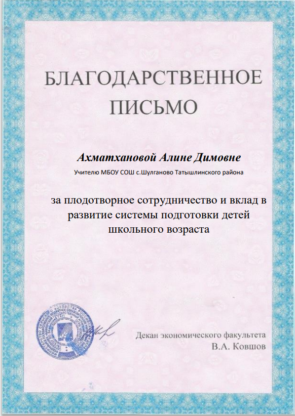 Поздравляем педагога внеурочной деятельности аграрного направления Ахматханову А.Д. с вручением благодарственного письма декана экономического факультета БГАУ.Молодцы!