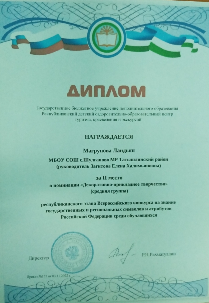 Поздравляем обучающуюся 8 класса Магрупову Ландыш и ее руководителя Загитову Е.Х. со 2 местом в номинации "Декоративно-прикладное творчество" республиканского этапа Всероссийского конкурса на знание государственных и региональных символов и атрибутов РФ среди обучающихся.Молодцы!