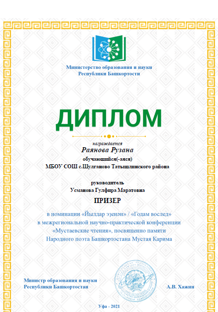 Поздравляем призеров межрегиональной научно-практической конференции "Мустаевские чтения", посвященной памяти народного поэта М.Карима, обучающихся 9 класса, Раянову Рузану, Усманову Алсу и их руководителя Усманову Гулфиру Маратовну! Молодцы! Дальнейших успехов!