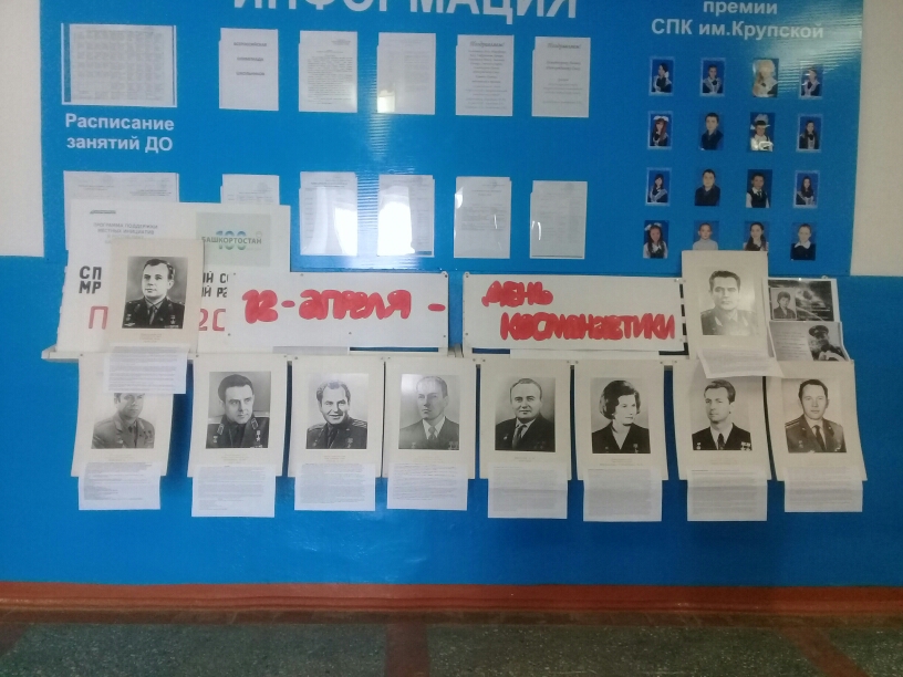 12апреля 1961 года впервые в мире на космическом корабле “Восток” совершил полет первый космонавт планеты - Юрий Алексеевич Гагарин. 58 лет назад началась новая эра – эра освоения космоса. Наша страна и весь мир отмечают это событие. В МБОУ СОШ с.Шулганово ежегодно в этот день проводятся мероприятия: классные часы, выставка рисунков, конкурс стихов и песен и т.д. В этом году учитель физики Шарафиева Г.Ф. оформила стенд, посвященный 58-летию полета космонавтики.