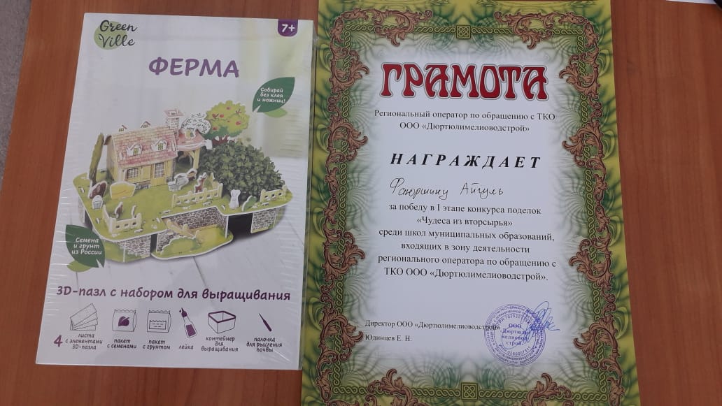 23 марта в МБОУ СОШ с.Шулганово Региональный оператор по обращению с ТКО ООО "Дюртюлимелиоводстрой"провели конкурс поделок "Чудеса из вторсырья". В данном конкурсе приняли 6 обучающиеся нашей школы. По итогам конкурса победила работа обучающейся 3 класса Фаюршиной Айгуль. Молодец, поздравляем!