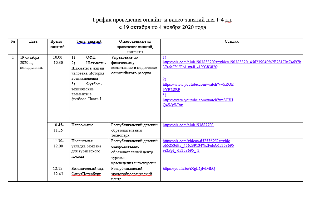 Министерством образования и науки Республики Башкортостан в целях организации занятости детей в период осенних каникул разработан график ежедневных занятий в режиме онлайн, проводимых педагогами дополнительного образования с обучающимися 1-4 и 5-11 классов.
