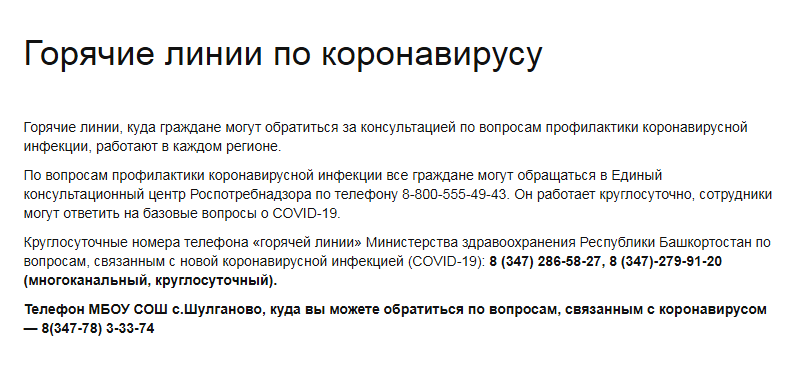 Круглосуточные номера телефона «горячей линии» Министерства здравоохранения Республики Башкортостан по вопросам, связанным с новой коронавирусной инфекцией (COVID-19): 8 (347) 286-58-27, 8 (347)-279-91-20 (многоканальный, круглосуточный).