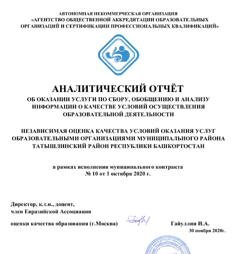 В период с октября по декабрь 2020 года все образовательные организации Татышлинского района прошли процедуру независимой оценки качества условий осуществления образовательной деятельности (далее - НОКУООД). Процедуру проводила Автономная некоммерческая организация «Агентство общественной аккредитации образовательных организаций и сертификации профессиональных квалификаций».